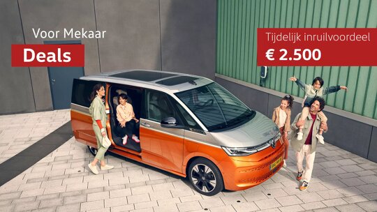 3. Het Voor Mekaar Deals inruilvoordeel van € 2.500 incl. btw is van toepassing op alle uitvoeringen van de Multivan en geldig t/m 30 september 2025. Het Voor Mekaar Deals inruilvoordeel van € 1.500 incl. btw is van toepassing op alle uitvoeringen van de Caddy Kombi eHybrid en geldig t/m 30 september 2025.