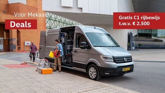 2. Voor het besturen van een Crafter 3,88t is een C1-rijbewijs verplicht. Afhankelijk van je situatie geldt ook een tachograafplicht. In combinatie met beroepsmatig vervoer is tevens code 95 kwalificatie verplicht. Houd er rekening mee dat de daadwerkelijke kosten voor het behalen van een C1-rijbewijs onder meer afhankelijk zijn van het ervaringsniveau van de bestuurder, de tarieven van de betreffende rijschoolhouder, de kosten voor een gezondheidsverklaring en medische keuring en het tarief voor het rijbewijsdocument in de betreffende gemeente, waardoor deze hoger kunnen uitvallen dan de vergoeding van € 2.500 excl. btw die je tijdens deze actie ontvangt bij aankoop van een Crafter 3,88t. Daarnaast moet de bestuurder minimaal 18 jaar oud zijn en in het bezit zijn van rijbewijs B. Afhankelijk van je situatie kunnen aanvullende kosten noodzakelijk zijn voor bijvoorbeeld een C1E-rijbewijs (bij gebruik van een aanhanger zwaarder dan 750 kg), een code 95 kwalificatie bij beroepsmatig vervoer en/of kosten die voortvloeien uit het gebruik van een tachograaf. Voor het besturen van een Crafter 3,88t met een aanhangwagen zwaarder dan 750 kg is een C1E-rijbewijs verplicht. Deze Voor Mekaar Deals actie is geldig t/m 30 september 2025.