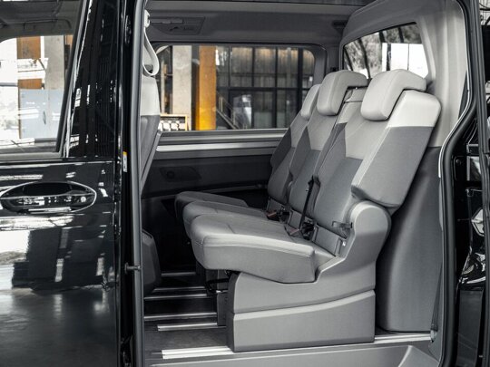 De Multivan is standaard uitgerust met in totaal zeven comfortabele zitplaatsen. Elke zitplaats in het passagierscompartiment kan afzonderlijk worden opgeklapt, binnen een bepaald bereik worden verplaatst en gemakkelijk worden verwijderd omdat het gewicht ervan met ongeveer 25 % is verminderd. Dit resulteert in talrijke stoelvarianten. Je kunt bijvoorbeeld extra ruimte voor bagage creëren door de stoelen van de derde rij naar voren te schuiven. Als je de nieuwe Multivan met de standaard stoelconfiguratie bestelt, zijn de gordelspanners van de buitenste afzonderlijke stoelen altijd stevig met de carrosserie verbonden. De middelste zitplaats heeft een geïntegreerde automatische driepuntsveiligheidsgordel en kan naar wens in de passagiersruimte worden verplaatst.